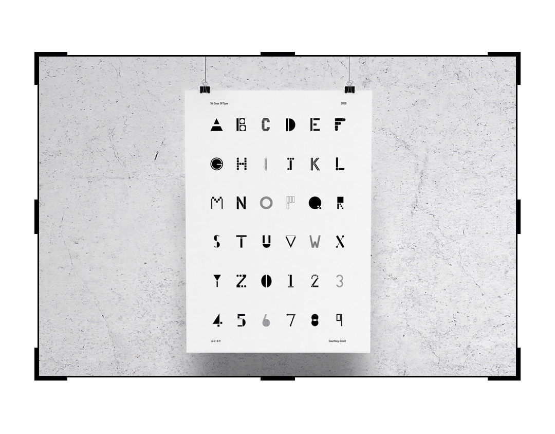 A monochrome font consisting of 36 letters, A-Z and 0-9 which have been made by putting different basic shapes together.